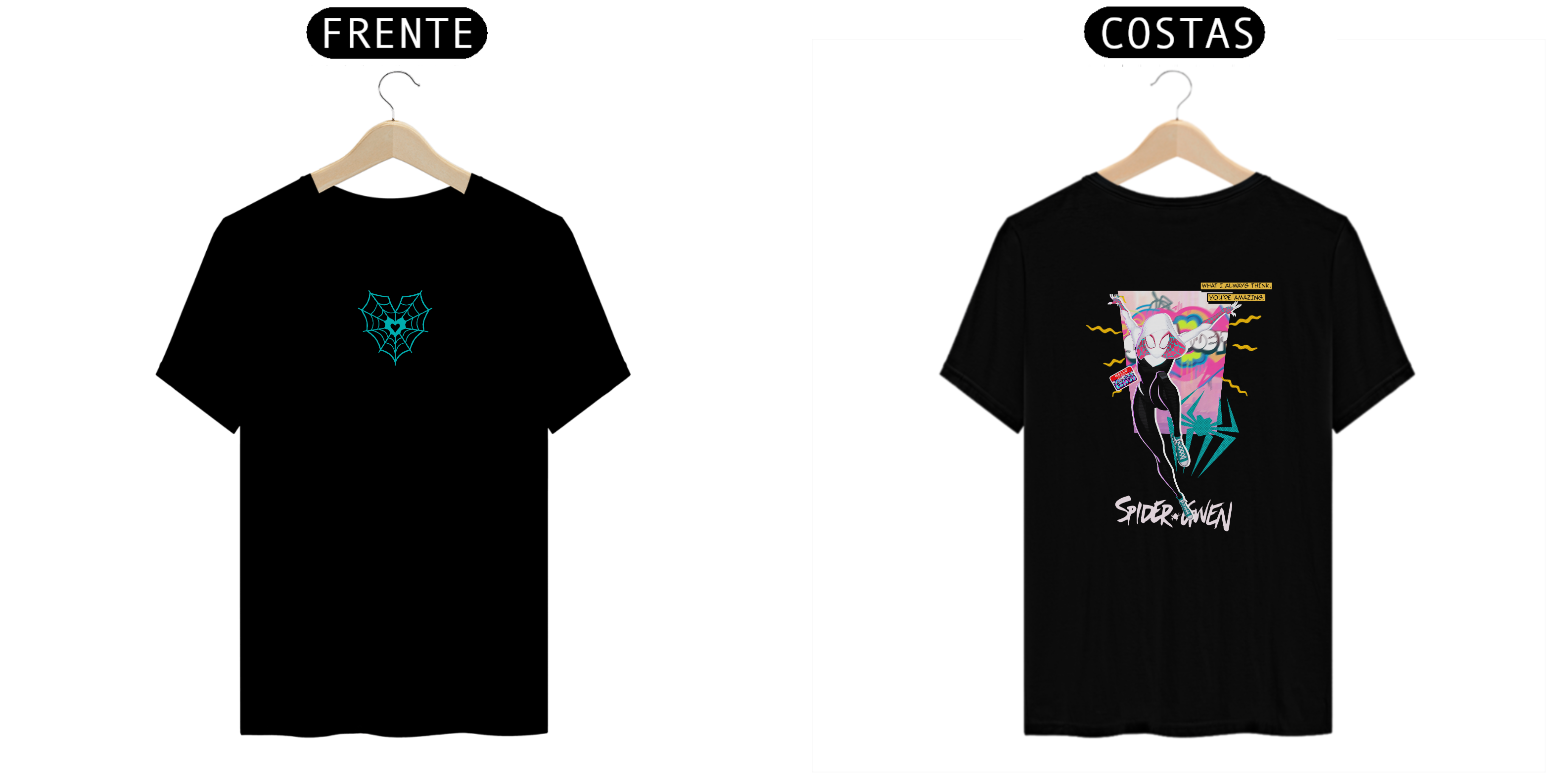 Spider-Gwen estrela essa estampa com um visual cheio de atitude e cores neon! A frase "You're amazing" resume a admiração e o carinho em uma peça estilosa e moderna. Perfeita para quem quer demonstrar amor, força e admiração para aquela pessoal mais especial do multiverso.