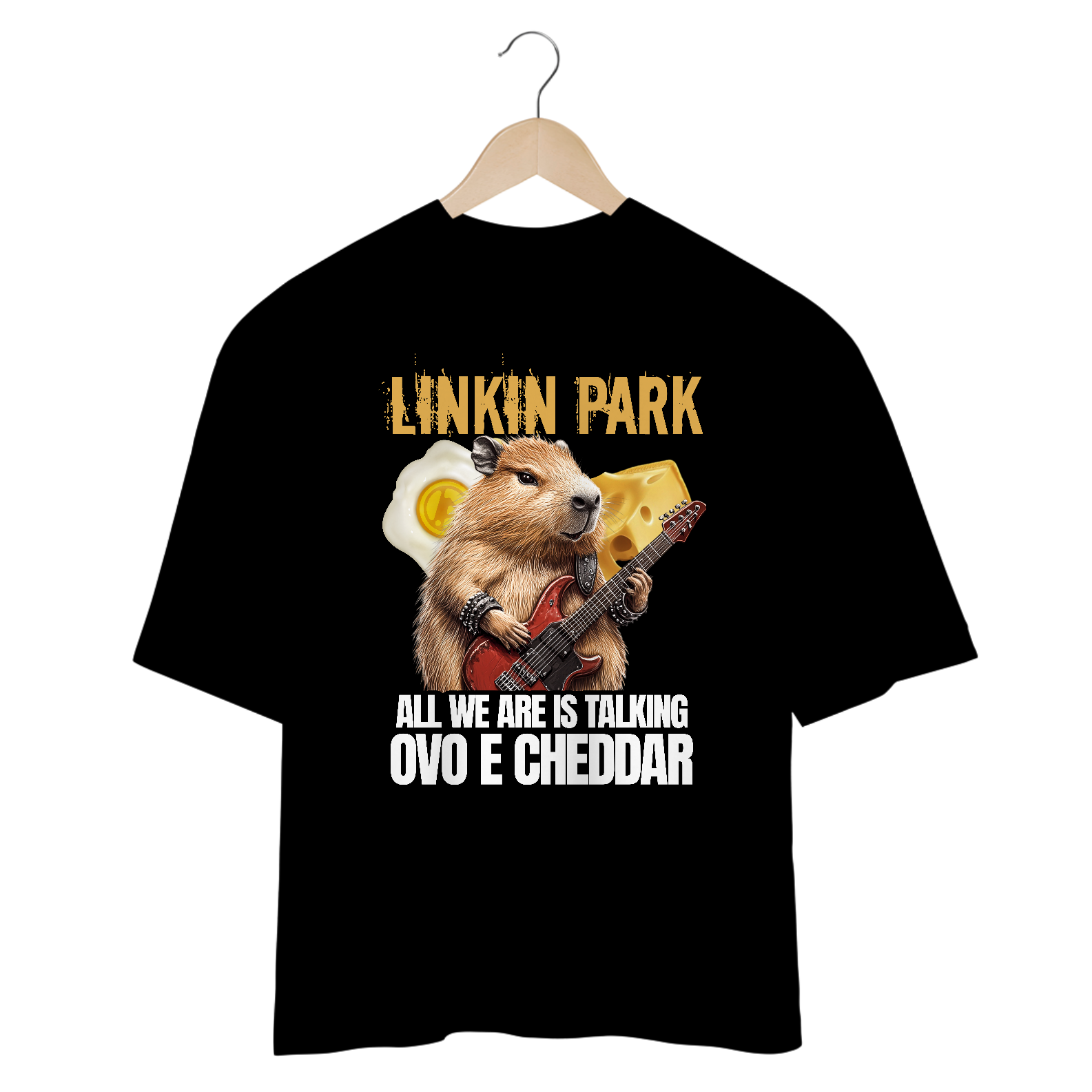 Agora não dá mais pra ouvir 'Over Each Other' sem cantar 'Ovo e Cheddar'! Essa camiseta é pra quem ama Linkin Park e não perde a chance de entrar na brincadeira.